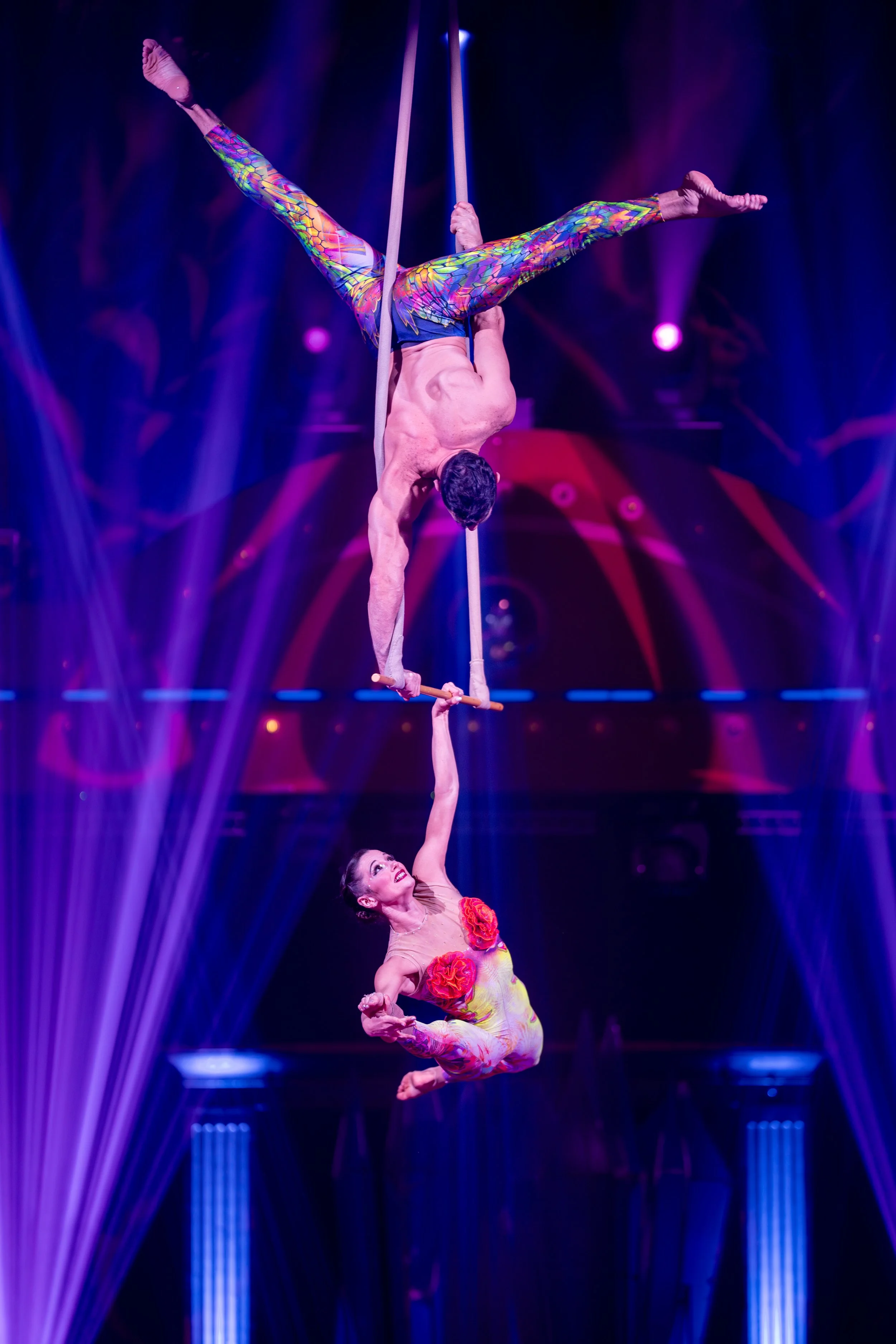 Notre numéro signature est un duo de trapèze danse, une création originale où se mêlent acrobaties et fluidité chorégraphique. À la fois technique et poétique, ce numéro inédit reflète l’identité de notre duo et la singularité de notre univers artistique.