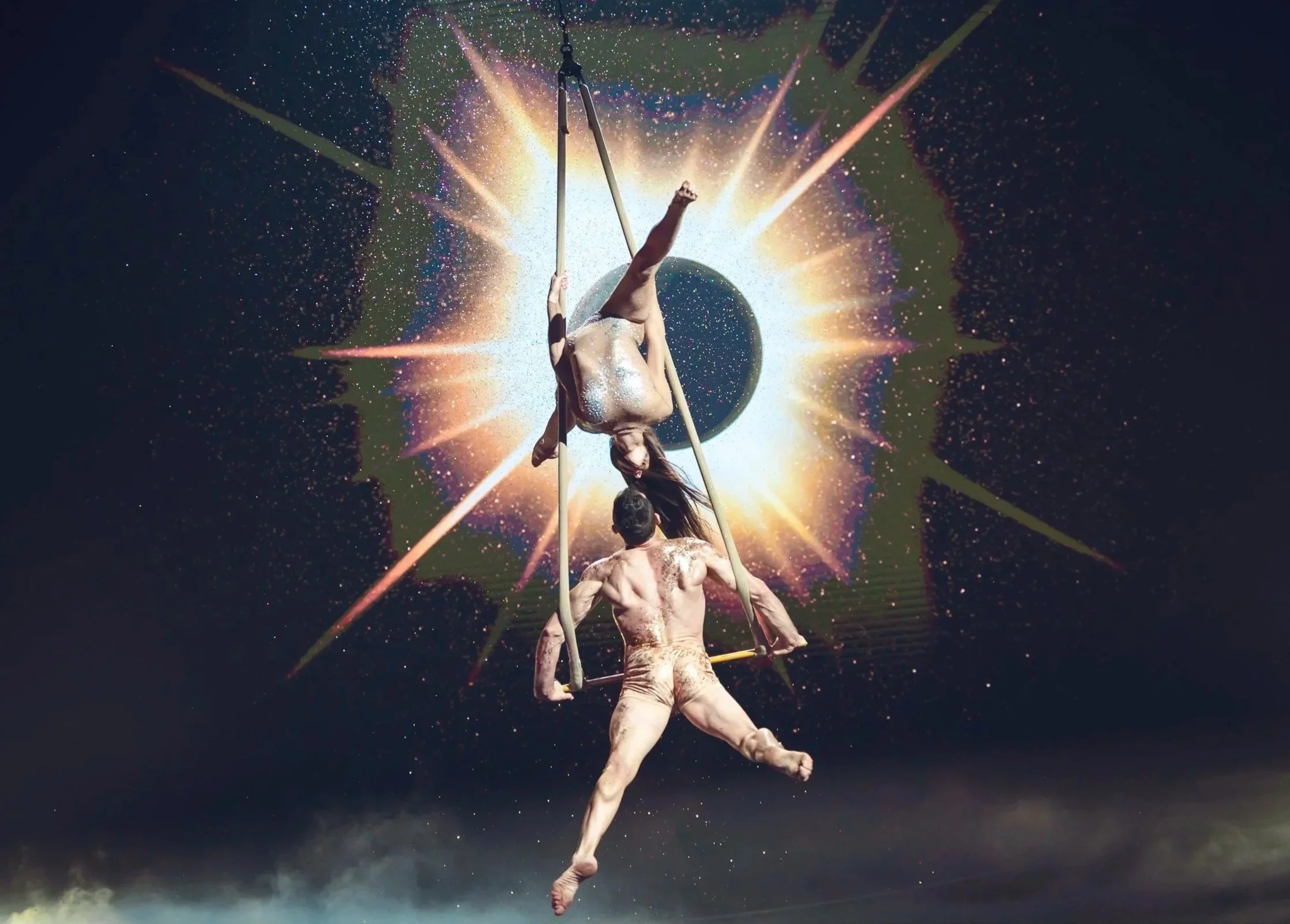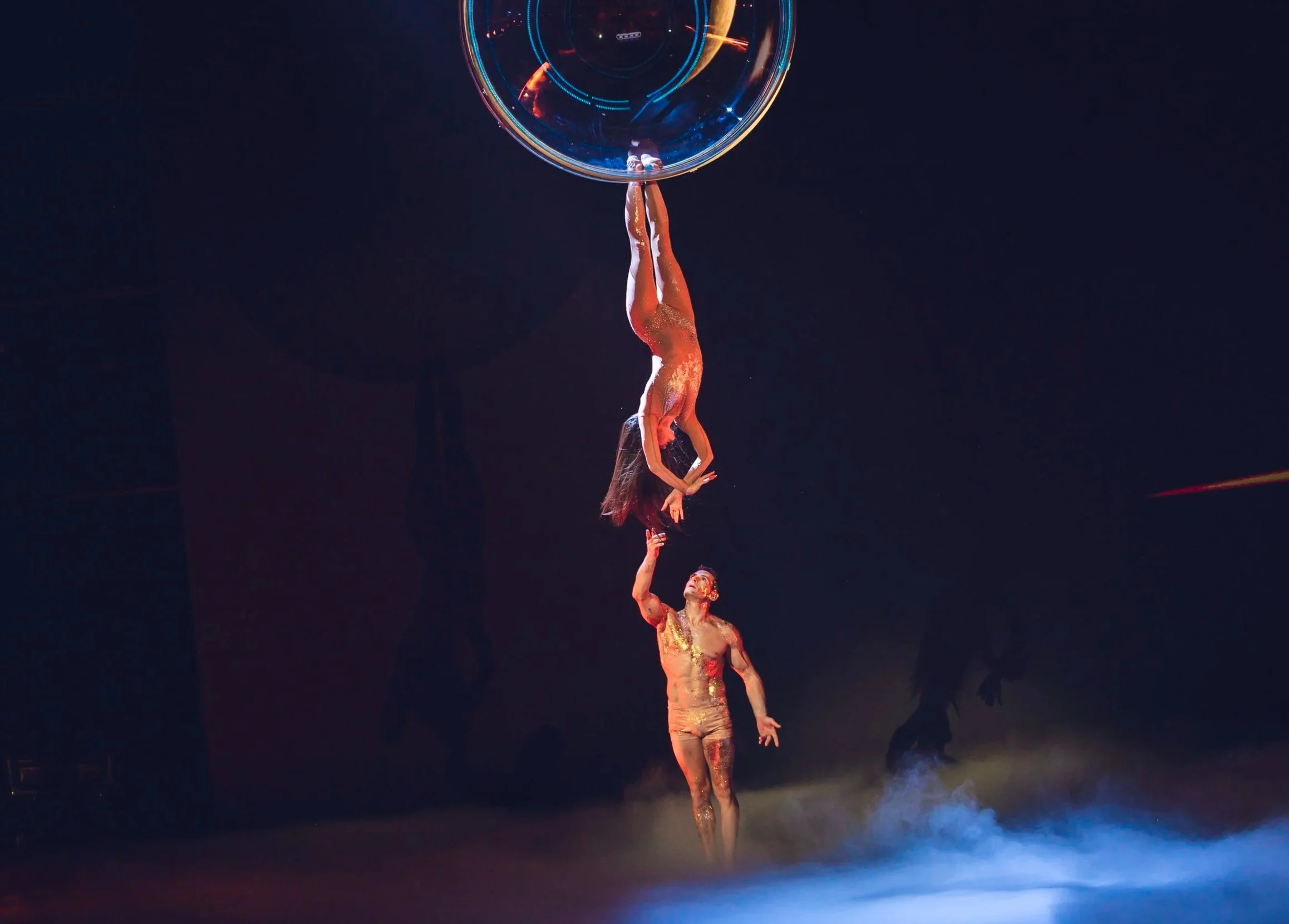 Le miroir, tour à tour barrière et portail, finit par les réunir. Ensemble, ils se découvrent comme deux flammes jumelles, guidées par une force invisible. Dans un numéro aérien final, ils s'élèvent, leurs âmes enfin unies. La scène se clôt sur une étreinte douce, marquant la fin de leur voyage intérieur et l'acceptation de l'autre comme miroir de soi.