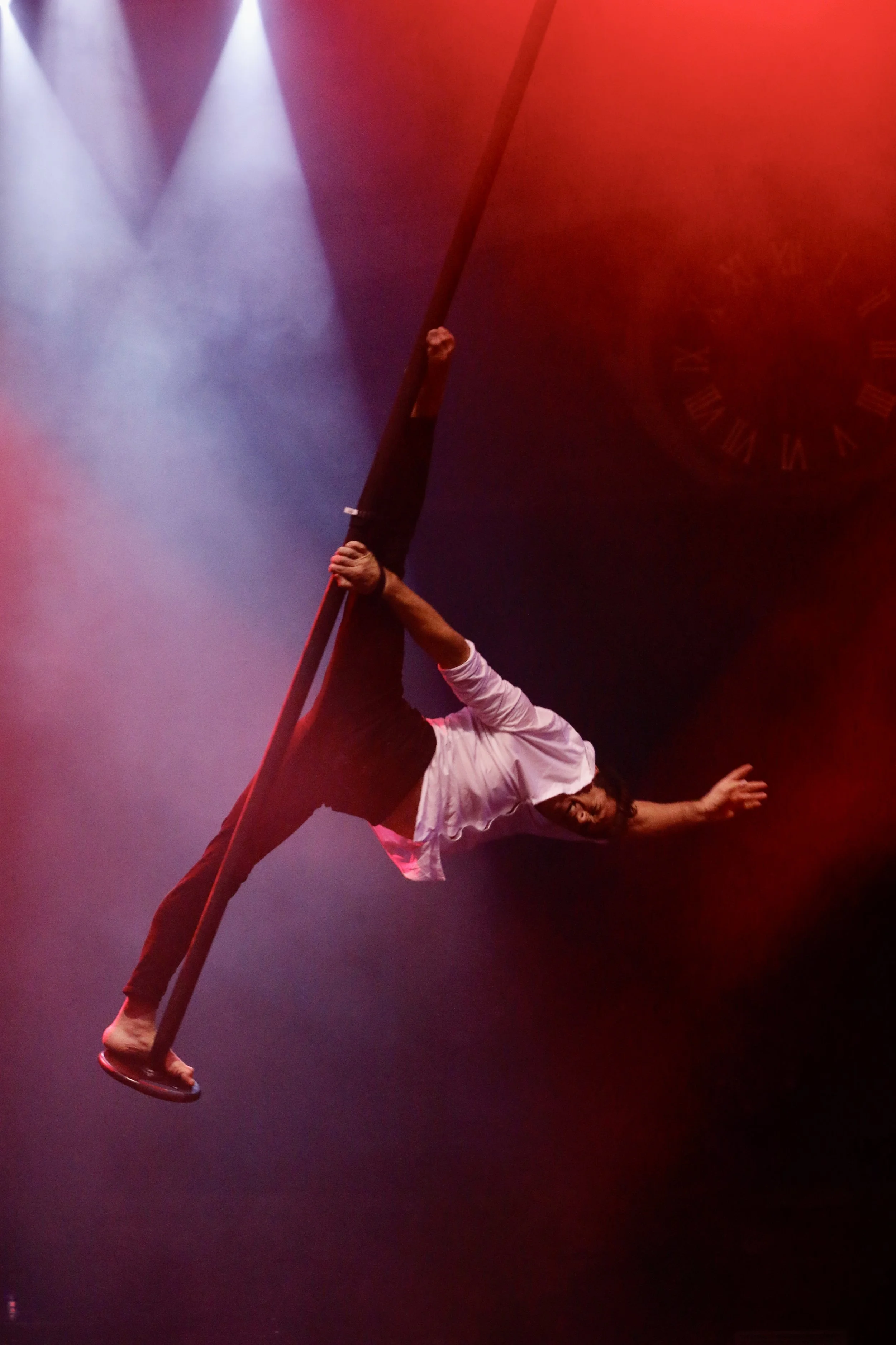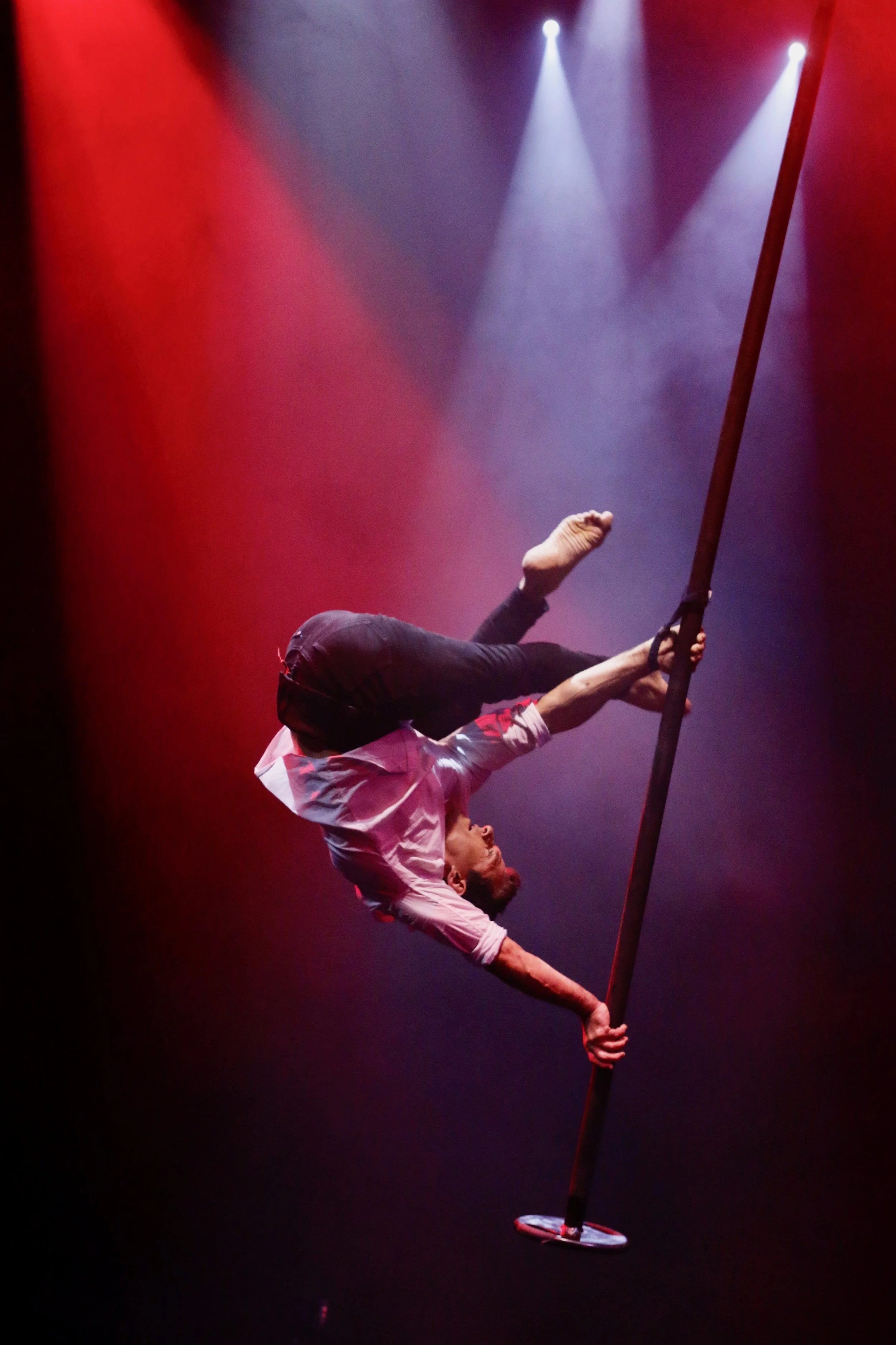 « A magnetic presence, effortless mastery. »On a pole suspended in midair, the artist moves with controlled strength and surprising lightness.